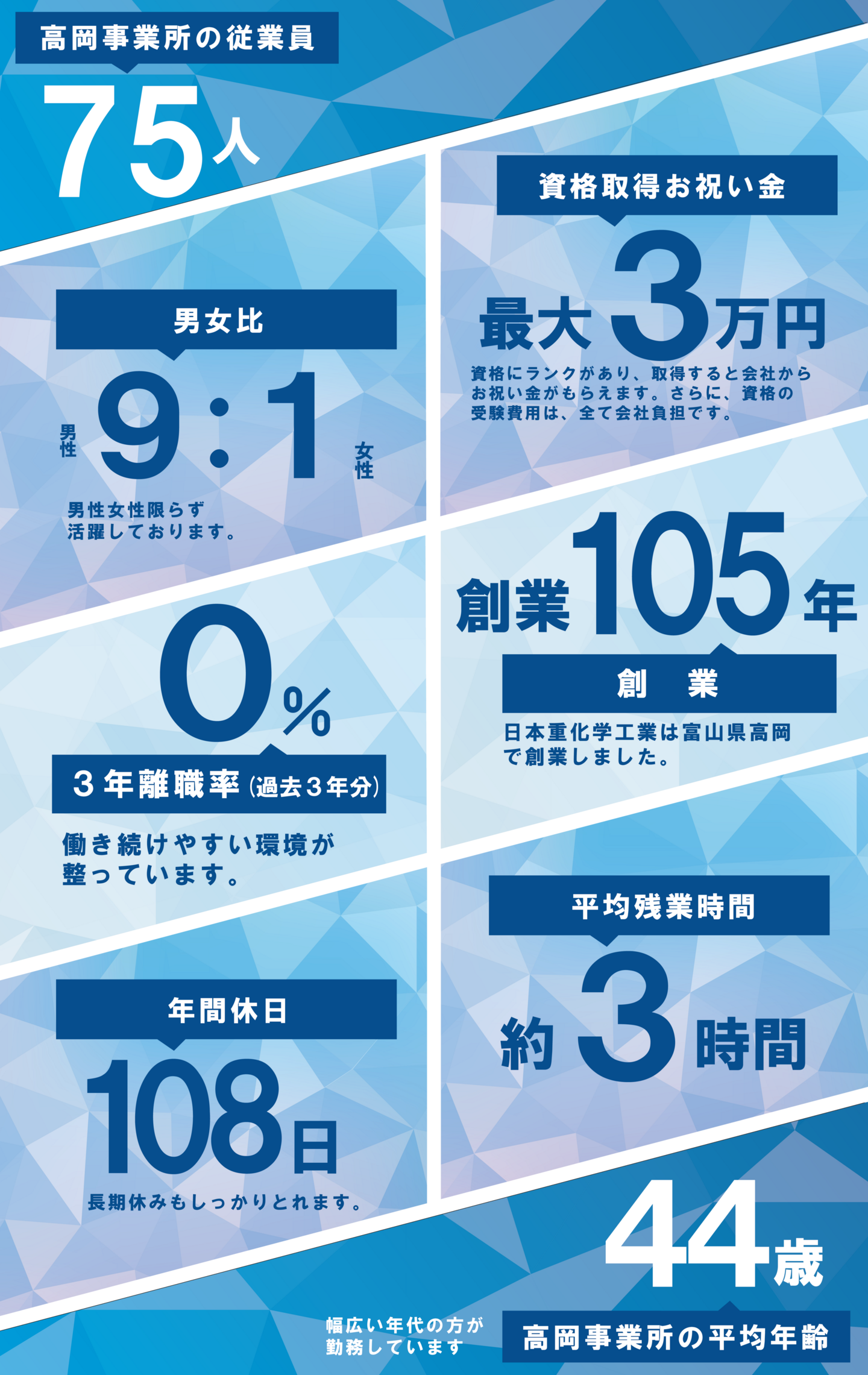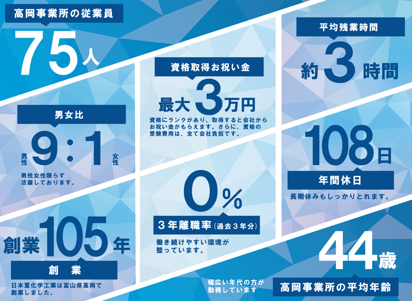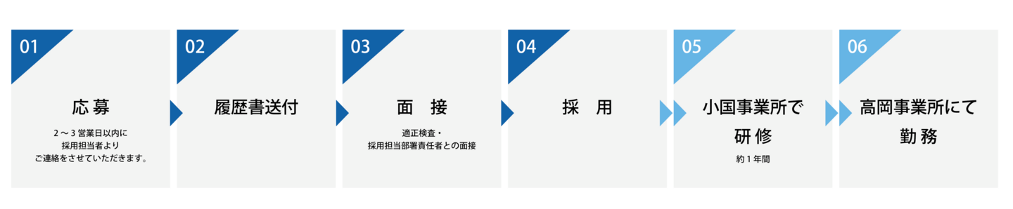 ・正社員の場合、全国転勤あり ・高岡事業所で採用し、研修のため約1年間 小国工場での勤務となります。 |