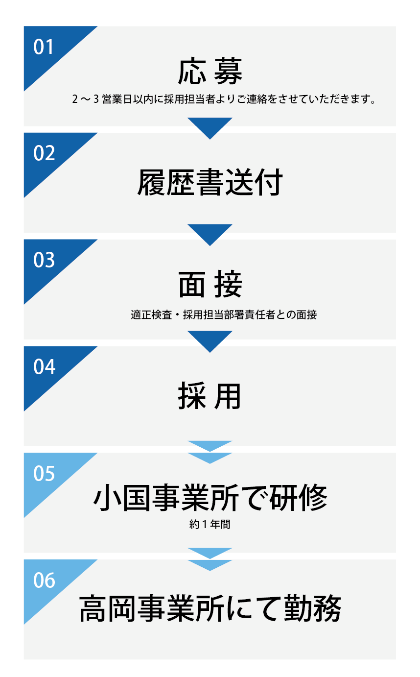 ご応募の後、まずは弊社採用担当者より、履歴書の送付先などのご連絡をさせていただきます。履歴書をご送付いただき次第、書類選考に入り、選考の上、追って結果を書面またはメールでご連絡いたします。